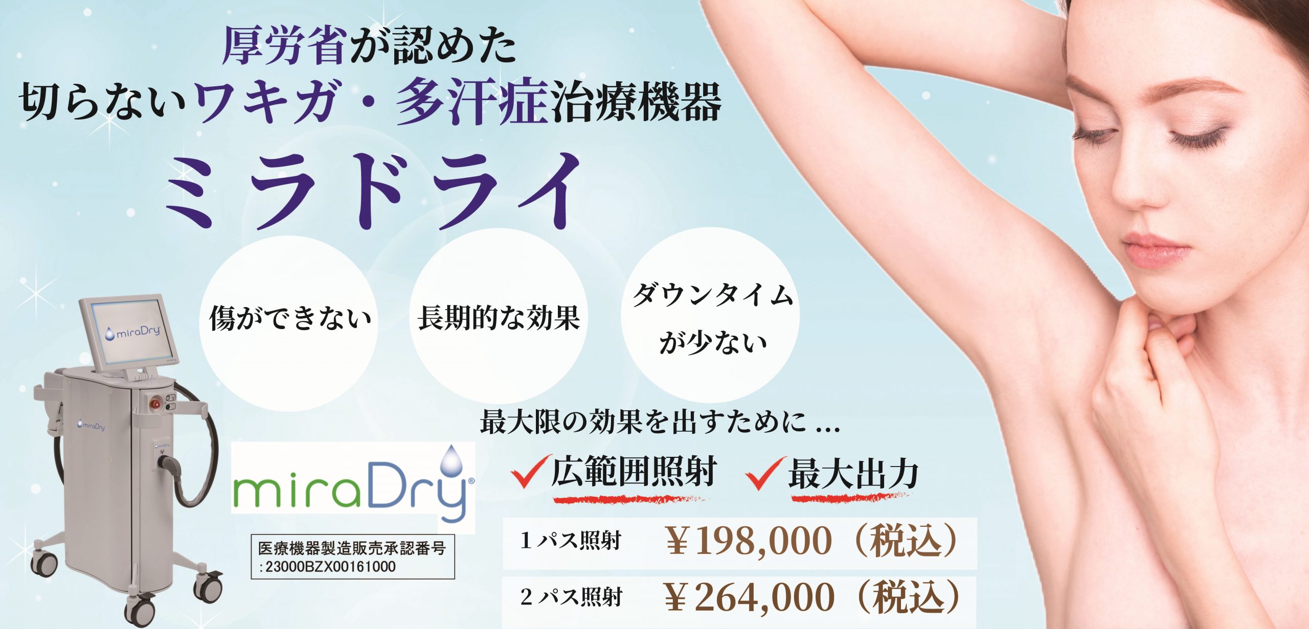 ミラドライは、皮膚を切らずに、マイクロ波というエネルギーを使って汗やにおいの元になる汗腺を減らす治療です。